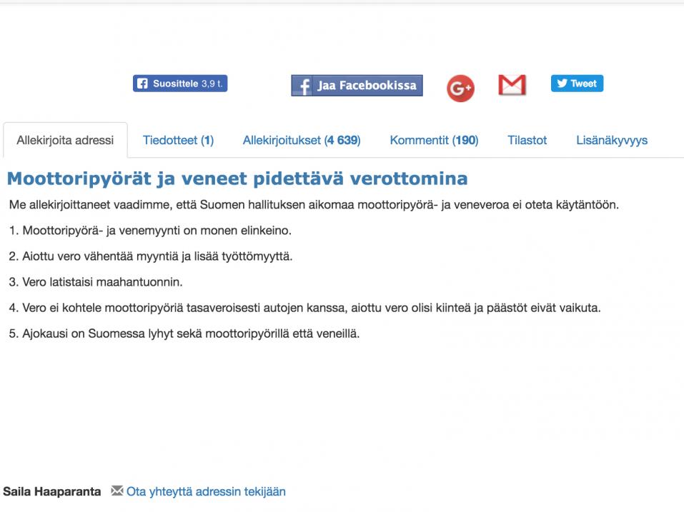 "Me allekirjoittaneet vaadimme, että Suomen hallituksen aikomaa moottoripyörä- ja veneveroa ei oteta käytäntöön.
