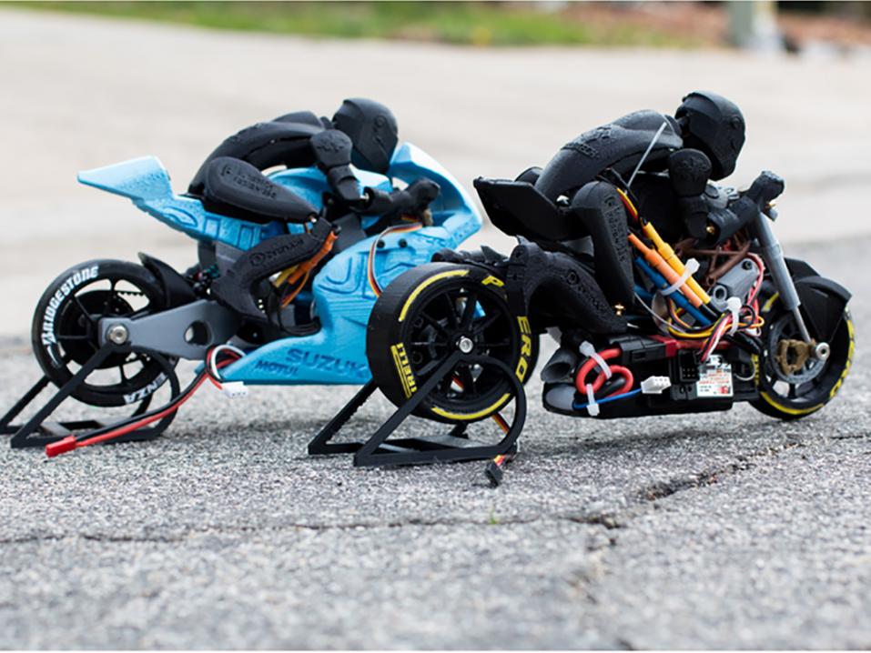 2016 Suzuki GSX-RR MotoGP-pyörän sekä vuosimallin 2016 Ducati Draxter Concept Drag Biken 3D-tulostetut radio-ohjattavat pienoismallit.