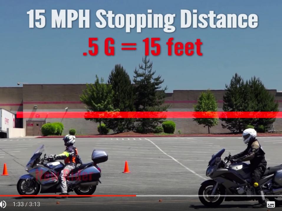 Videolla demonstroidaan moottoripyörän hidastuvuuden eroja eri nopeuksista. Jarruttajina ovat rinnakkain se noviisi, joka jarruttaa 0,5 G:n teholla ja sitten se ekspertti, jonka pyörän hidastuvuus on 1 G.