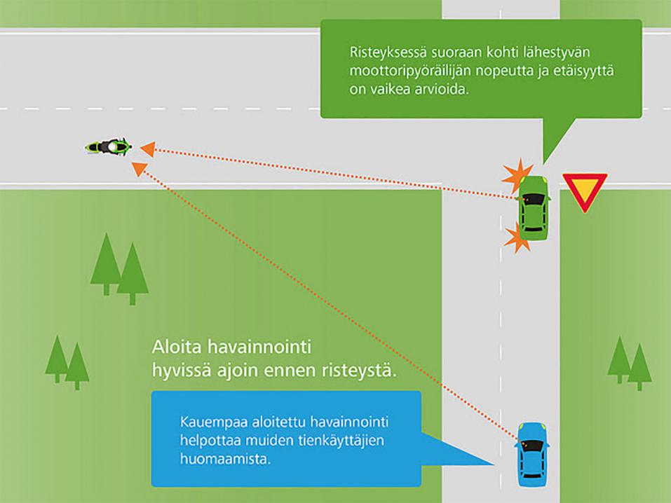 – Onnettomuuksissa näkyy selkeästi autoilijan havaintovirhe. Risteyksessä kohtisuoraan lähestyvä moottoripyöräilijä voi jäädä rekisteröimättä, jos katse hakeekin auton kokoista menopeliä. Sivutieltä tullessa kannattaa mahdollisuuksien mukaan aloittaa päätien havainnointi jo ennen risteystä. Näin liikenteen huomaaminen ei jää vain yhden havainnointikohdan varaan, Vuoristo kannustaa.