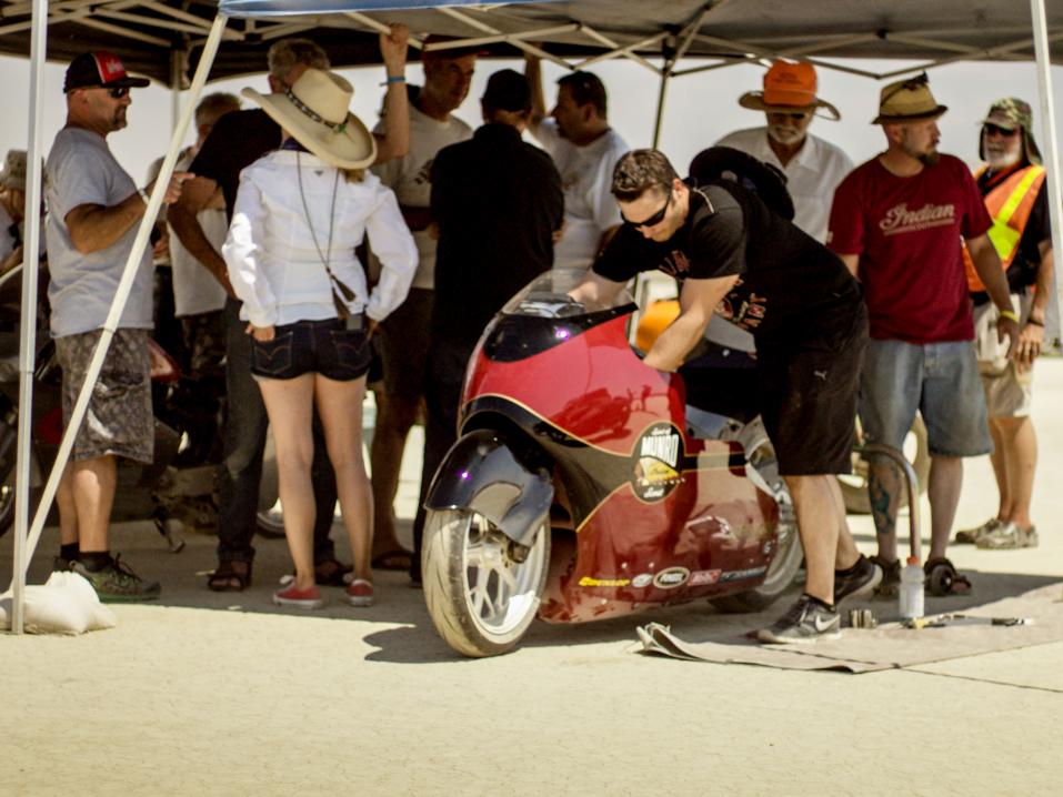 Ensimmäisenä oli vuorossa Chet Michaelson, Indianin moottorikalibraatioteknikko. Hän ajoi Indianillaan M-PG (Modified-Pushrod Gasoline) 2000cc -luokassa 2015 Indian Chief Classicilla. Chet löi vanhan ennätyksen, 243 km/h, ja uusi kirjataan nyt 248 km/h.