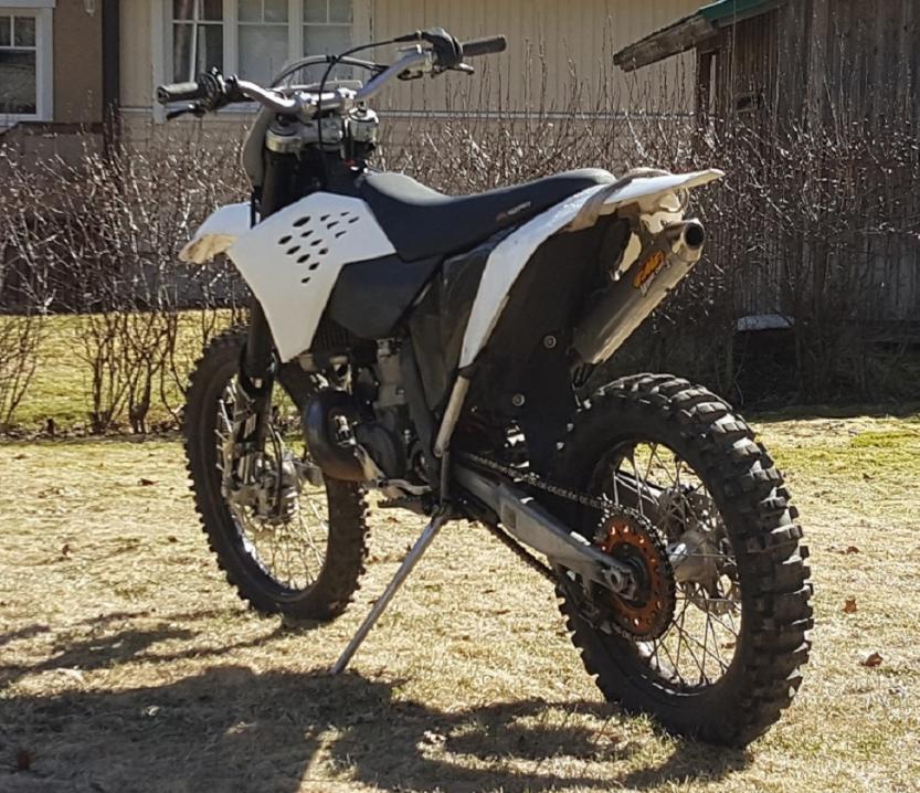 Poliisi kaipaa tietoa kuvan kadonneesta KTM 250 EXC moottoripyörästä. Pyörä anastettiin Keuruun keskustasta kerrostalon pihalta kesäkuun alussa. Moottoripyörä ei ollut rekisterissä.