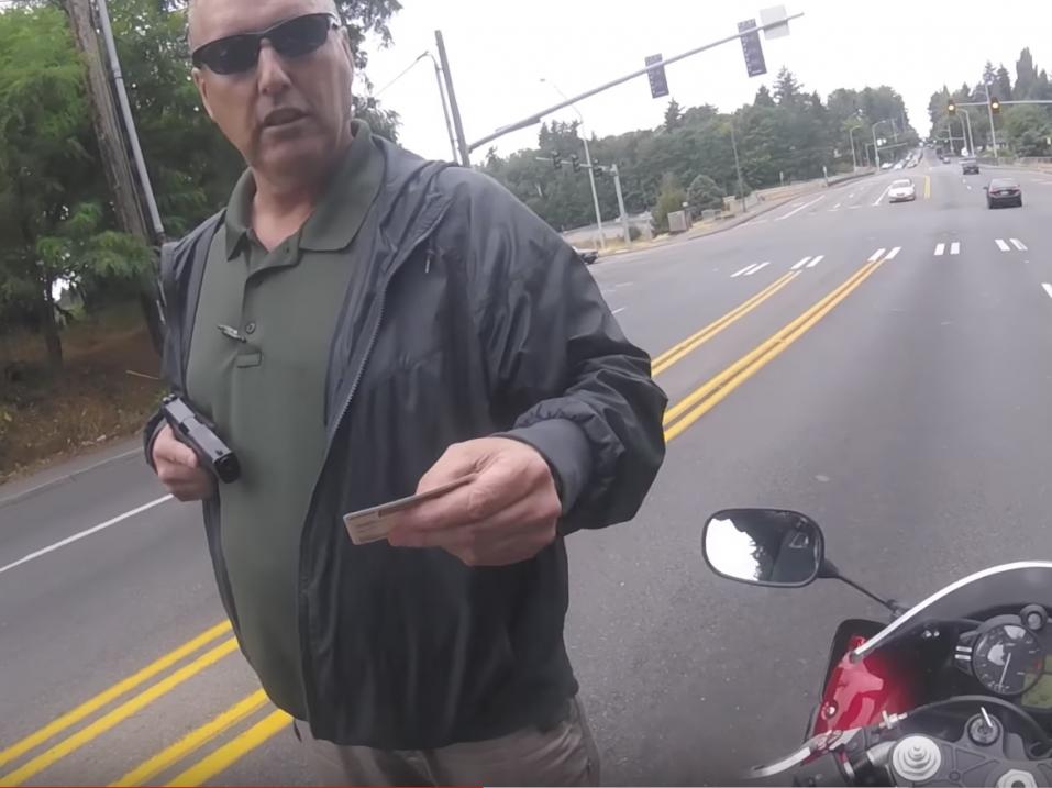 Washingtonin osavaltiossa asuva Alex Randall oli ajamassa Yamaha R1:llä 16.8. kuluvaa vuotta, kun hän pysähtyi liikennevaloissa. Odotellessaan valojen vaihtumista, hänen kypäräkameransa kuvaamasta videosta näkyy, mitä tavallisessa kadunmiehen asussa oleva poliisietsivä lähestyy häntä jalan, ja osoittaa pistoolilla.