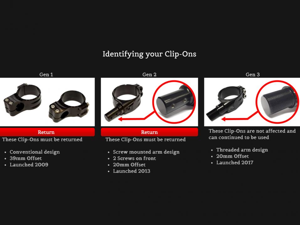 Renthal takaisinkutsuu tyypin Gen 1 ja Gen 2 clip-on ohjaustangot. Ensin mainittua on valmistettu vuodesta 2009 ja viimemainittua vuodesta 2013 lähtien. Kaikkiaan Renthal on saanut 22 ilmoitusta tapahtuneista murtumista, loukkaantumisia ei kuitenkaan ole tapahtunut.