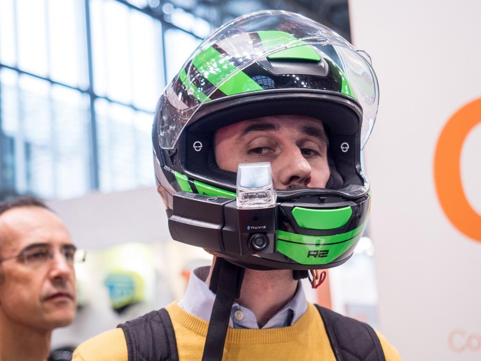 Nuviz oli mukana kahdella eri osastolla Milanossa. Toinen niistä kuului moottoripyörävalmistaja KTM:lle, joka on myös yksi Nuvizin rahoittajista. Toinen oli puolestaan se, missä tapasimme Petri Hirvosen, eli kypäränvalmistaja Schuberthin osastolla. Nuviz on valmistanut Schuberthille erikoisversiota HUD:illa varustetusta navigaattori-toimintakeskuksestaan.