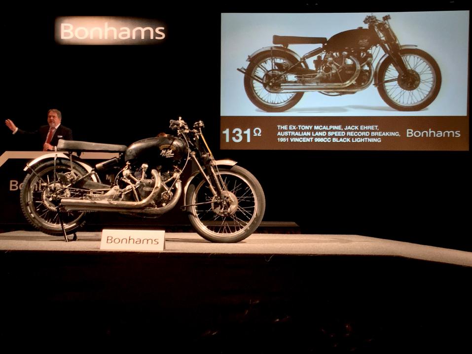 Rio Hotel & Casinon juhlasalillinen ihmisiä puhkesi ilon ja suosionosoitusten pauhuun, kun Bonhamsin huutokauppameklari Malcolm Barber myi erittäin harvinaisen alkuperäiskuntoisen, aitoakin aidomman brittiläisvalmisteisen australialaisen nopeusennätysten murskaajan vuosimallin 1951 Vincent Black Lightningin 929 00 dollarin, 748 770 euron hintaan. Se teki siitä kalleimman koskaan huutokaupassa myydyn moottoripyörän, kerrotaan Bonhamsin tuoreessa tiedotteessa.