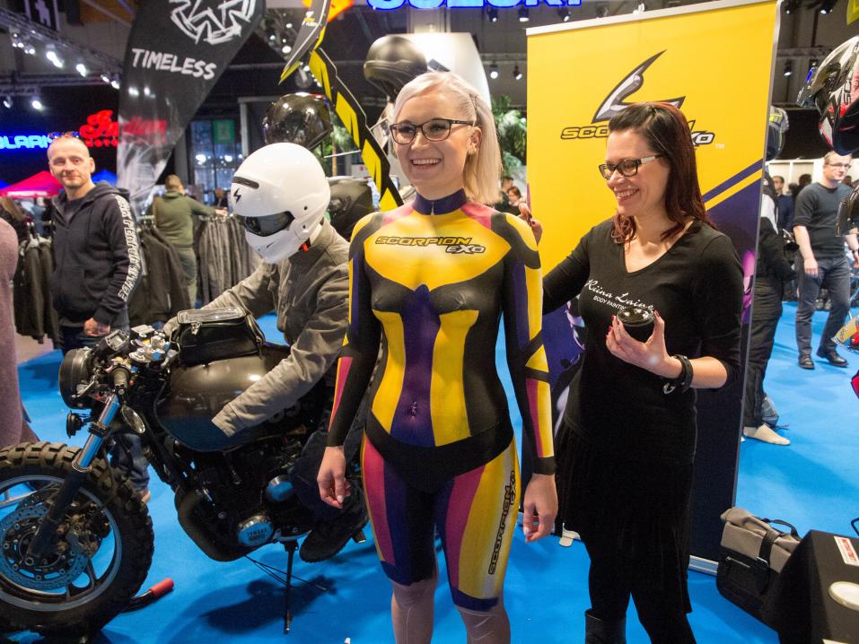 – Olen tehnyt vartalomaalauksia noin kymmenen vuotta. Tämä on ensimmäinen kerta moottoripyrämessuilla, mutta muilla messuilla ja eri tapahtumissa olen aikaisemminkin tehnyt maalauksia yleisön edessä. Kokovartalomaalaukseen kuluu aikaa helposti 5-6 tuntia ja yksityiskohdista riippuen aikaa voi vierähtää jopa 12 tuntia, kertoo vuonna 2014 vartalomaalauksen maailmanmestaruuden voittanut Riina Laine.