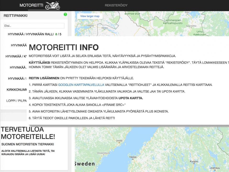 – Lähdin tekemään Motoreitti-sivustoani lähinnä pikkuprojektina, johon saisin upotettua aikaani kevättä odotellessa. Aloin kehittämään sitä tämän vuoden alkupuolella testimielessä, mutta loppupeleissä tämänhetkinen versio valmistui yhden viikon spurttina, jolloin omissa töissäni oli hiljaisempaa, Joni Järvenpää kertoo.
