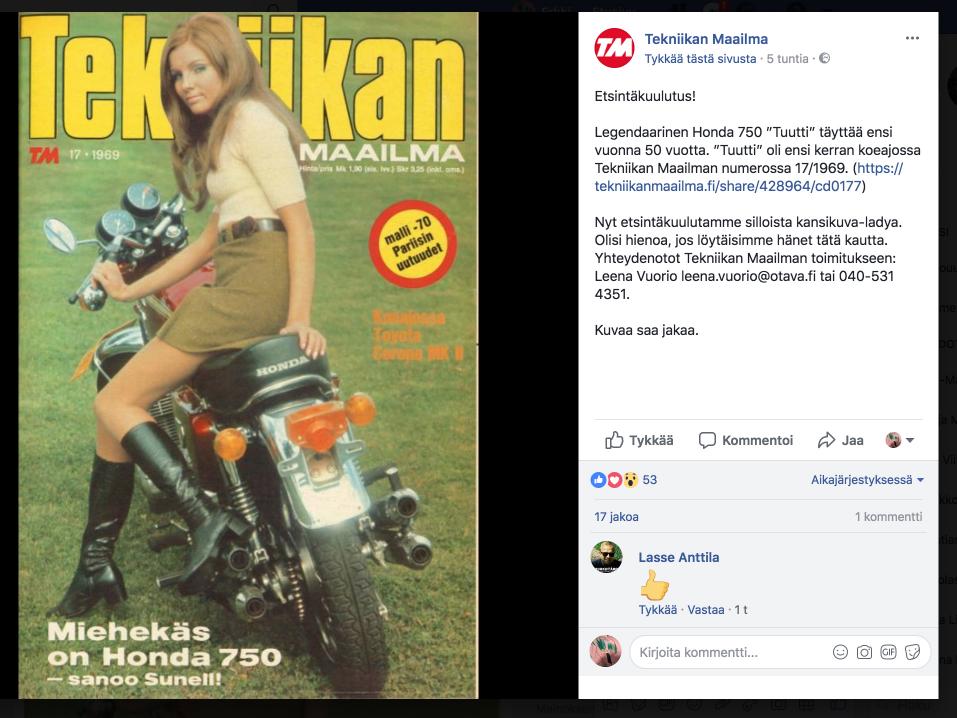 Legendaarinen Honda 750 ”Tuutti” täyttää ensi vuonna 50 vuotta. ”Tuutti” oli ensi kerran koeajossa Tekniikan Maailman numerossa 17/1969. (https://tekniikanmaailma.fi/share/428964/cd0177)