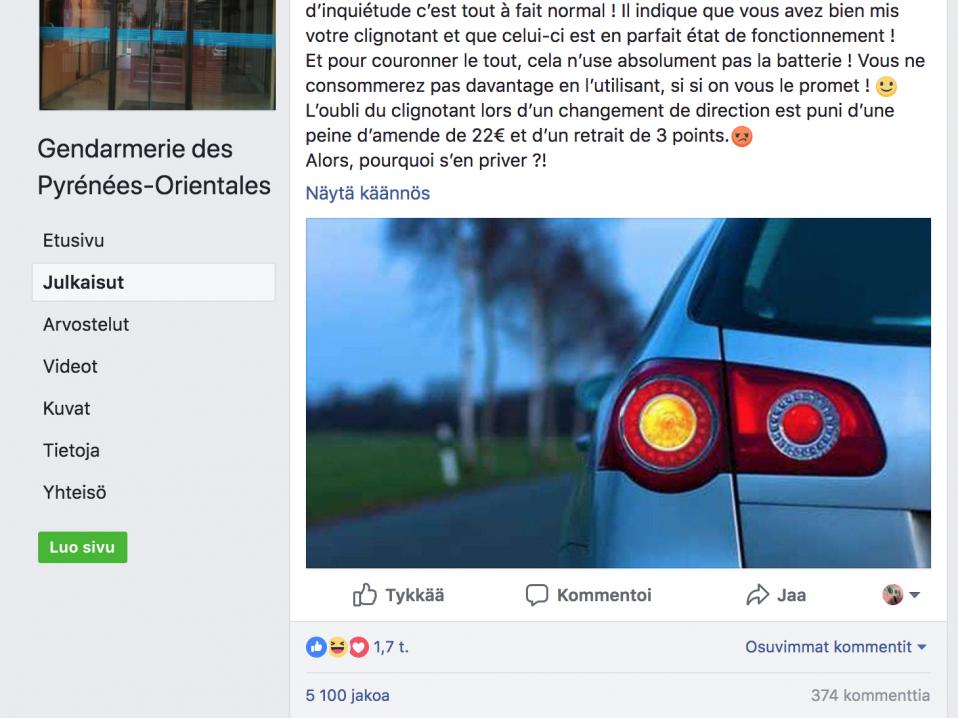 Pyrénées-Orientalesin alueen Santarmilaitos varoitti viime viikolla "autojen vilkkujen huolestuttavasta katoamisesta" ja on pyytänyt todistajia ilmoittautumaan hauskassa yrityksessä saada kuljettajat muistamaan vilkun käytön tärkeyden.