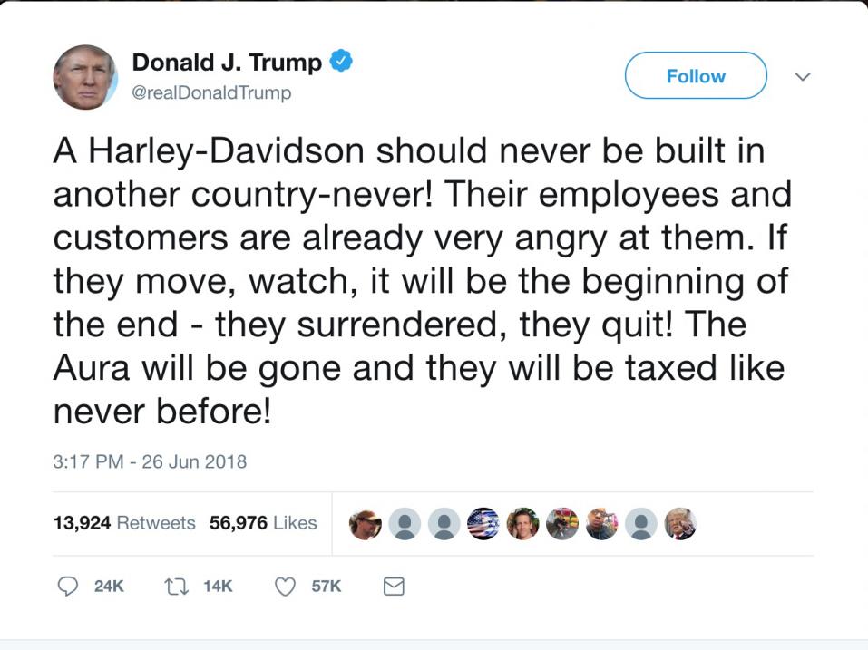Eilen tiistaina Trump muisti Harleytä illan suussa twiitillä, jossa totesi, että "Yhtään Harley-Davidsonia ei koskaan pitäisi valmistaa toisessa maassa - ei koskaan! Heidän työntekijänsä ja asiakkaansa ovat jo hyvin vihaisia heille. Jos he muuttavat, niin katso, se tulee olemaan lopun alkua - he antautuivat, lopettivat!"