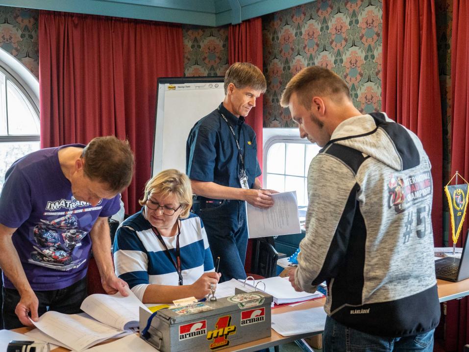 Saapuessamme paikalle kisatoimistossa oli jo aika rauhallista. Juha Suikkari apunaan Hannu Torkkeli ja Marjaana Packalen ottivat vastaan kilpailijoiden ilmoittautumisia kun puolestaan Tuomo Seppänen ja Minna Rautio toivottivat mediaväen tervetulleeksi.