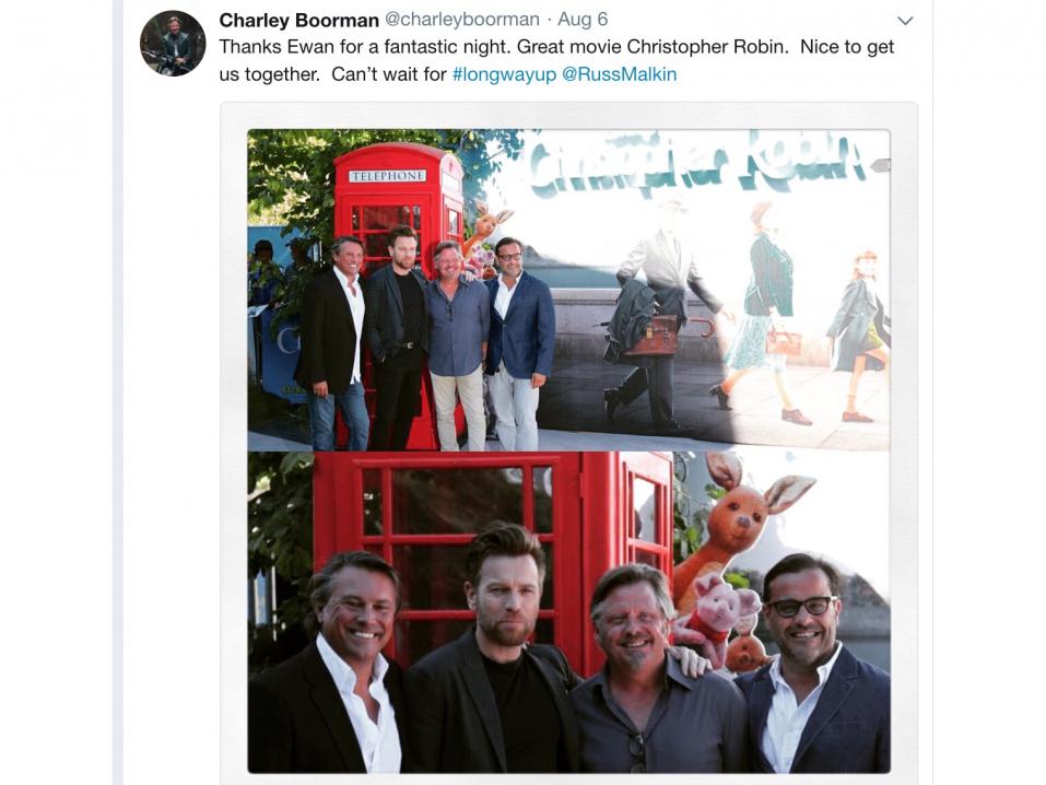 Charley Boorman oli mukana Ewan McGregorin uuden elokuvan Christopher Robinin esityksessä, ja Boorman käytti virallista Twitter-tiliään kiittääkseen McGregoria hetkestä sekä kirjoitti twiittiinä, "ettei voi odottaa #longwayupia".