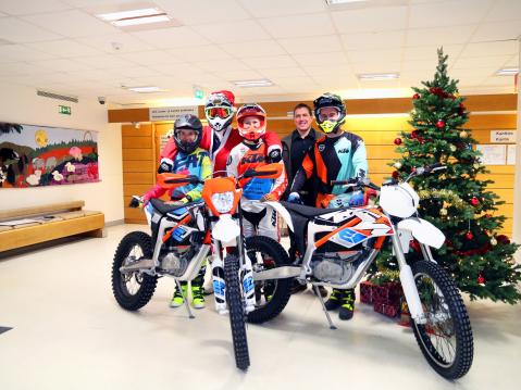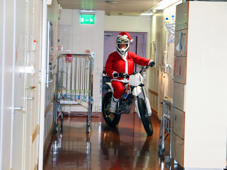 Enduron SM-mitalistit Niko Aitta (joulupukki) ja Kimmo Hurri, enduron naisten Euroopan ja maailmanmestari Sanna Kärkkäinen sekä junioricrossari Noora Uro ilahduttivat lapsia ajamalla KTM:n sähköenduropyörillä osastoilla ja käytävillä. Lisäksi he ajoivat osaan niistä huoneista, joista lapset eivät voineet poistua käytäville.