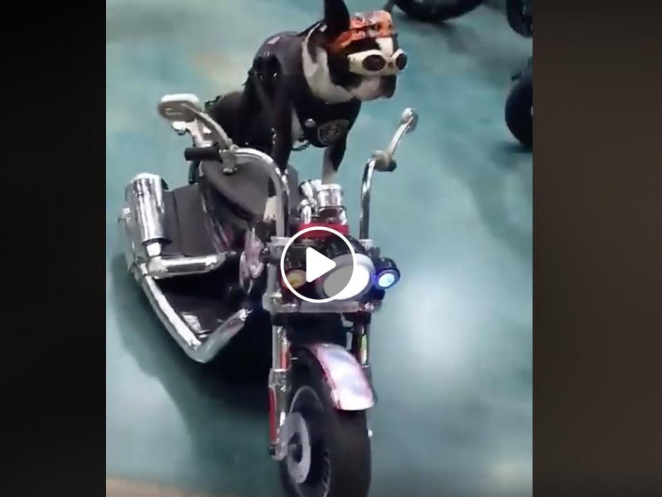Oheisella videolla koirabikeri ajelee tyytyväisen - ja kieltämättä coolin - näköisenä moottoripyörällä ympäri aluetta, joka näyttäisi moottoripyöränäyttelyltä. Kyllä tällaista katselisi Messukeskuksessakin, vai mitä?