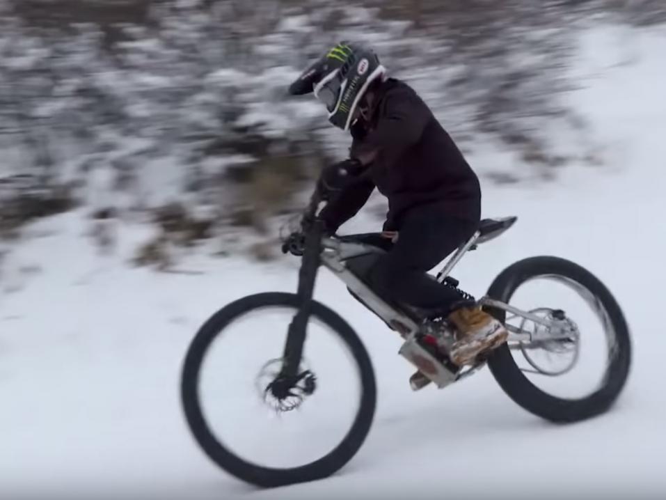Jacko Strong on X Games -kisojen kultamitalisti ja kaahaa talvisella jotoksella H-D:n uudella sähköisellä konseptipyörällä Aspenin vuoden 2019 X Games -kisojen aikaan.