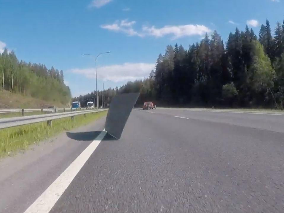 Mika Kauppilan video kertoo muutamassa kymmenessä sekunnissa koko tapahtumasarjan. Moottoritiellä edellä ajavan auton perässä on peräkärry. Kovassa vauhdin ja ajoviiman vuoksi peräkärryn pohjalevy sekä pala ruostunutta teräspalkkia repeytyy irti, ja lentää kohti motoristia, joka aloittaa jarrutuksen.