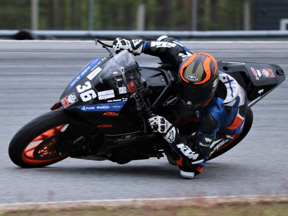 Viikonloppu aloitettiin jo torstaina ja perjantaina vapailla harjoituksilla. Vauhtia haettiin maltilla ja pyörä toimi tällä kertaa fantastisesti. Lauantain aika-ajoissa iski sadekeli eikä Juho löytänyt millään tuntumaa saderenkailla. Tuloksena heikko sija 6.