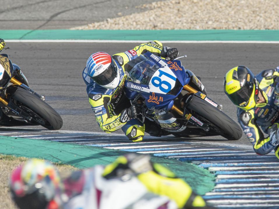 – Kisaviikonloppuun mahtui hienoja onnistumisia ja epäonnea. Sijoitus toiseksi Q1:ssä, riski kuivan kelin renkailla Q2:ssa ei onnistunut, vaan sijoitus putosi 12. Ensimmäinen startti oli hyvää taistelua sijasta kymmenen kunnes arm pump vaiva pakotti hidastamaan ja sijoitus maalissa oli 16. Toisessa lähdössä oli vielä kovempaa taistelua sijoituksesta kymmenen joukkoon. Hyvä vääntö päättyi kaatumiseen, kun ohitustilanteessa ajolinja ajautui leveäksi ja etupyörä osui märkään kohtaan, kun edellä ollut kuski peitti näkyvyyden. Ajo tuntui hyvältä ja vauhti nousi. Kun pienen ajoasennon muutoksen jälkeen käsikin tuntui kestävän paremmin, niin keskeytys todella harmittaa. Suuret kiitokset RAM Racingin Jani Rätölle ja Markku Visurille, jotka saivat Yamahan säädöt kohdalleen. Myös suuret kiitokset Aroafisiofimedin Aroa Olivaresille, joka huolehti käden hoidosta joka päivä, kertoi Nässi kilpailun jälkeen.