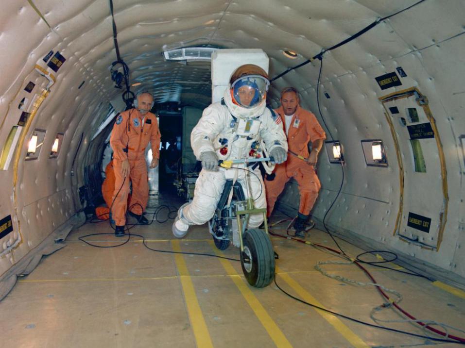 Kuvissa astronautti testaa kuuskootteria täydessä avaruusasussa KC-135 lentokoneen rahtitilassa.