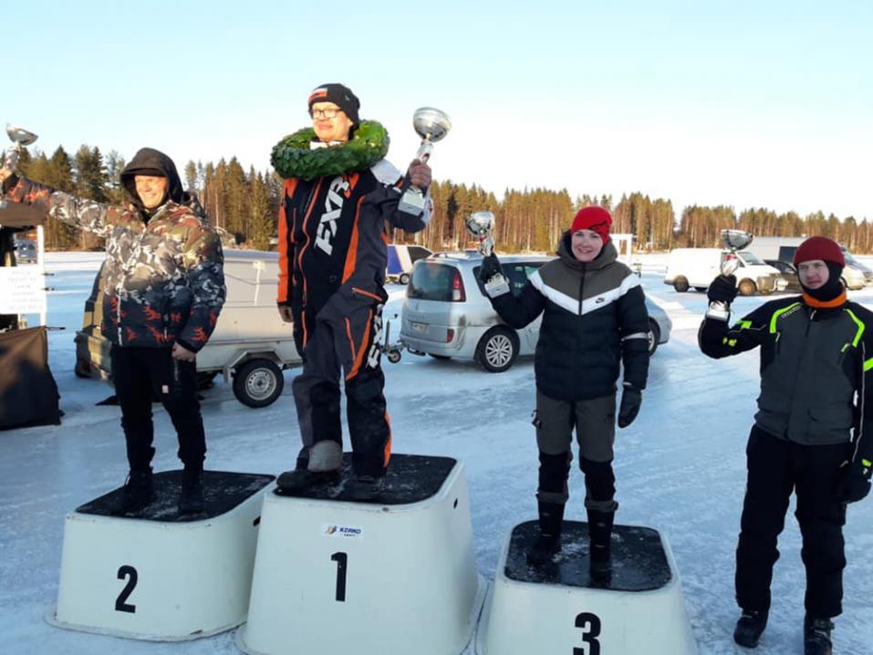 – Jääratatreenit ovat menneet hyvin, olen kehittynyt, vauhtia on löytynyt lisää ja ajattelin, että olisi mahdollista ajaa kympin sakkiin. Kun kauden treeneissä pääsin vertailemaan vauhtiani kovempien kuskien kanssa niin silloin heräsi ajatus, että vauhti voisi riittää jopa viiden sakkiin. Ja hyvinhän se riittikin. Olosuhteista ja koronaviruksesta johtuen jääradan SM-kisat ajettiin kerrasta poikki -meiningillä. Ymmärtääkseni Konnevedelle ei enää saatu henkilökuntaa paikalle, joten kausi typistyi yhteen, lauantaina Kajaanissa ajettuun kilpailuun, Kirsi Kainulainen kertoo.