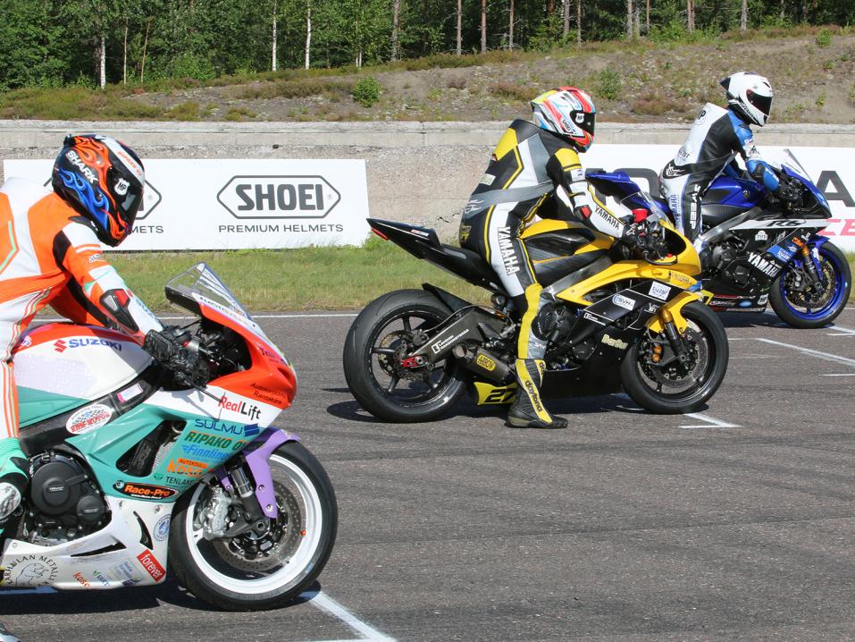 Superbike-luokan ensimmäisen kilpailun podium Magnus Collin (vas.), Ville Valtonen ja Peter Paloranta. Kuva: Harjukuvat.