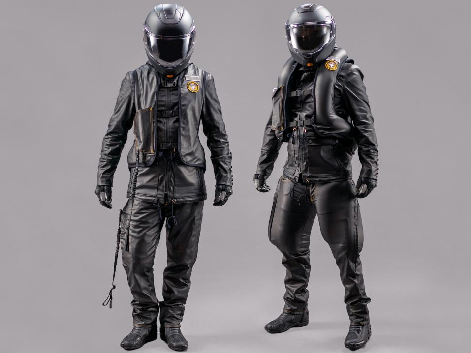Mo'cycle Airbag-farkut ja -liivi. Ilmatyynyt täyttyvät ilmalennon aikana ennen törmäystä.