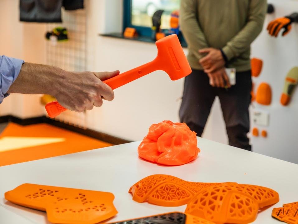 D3O:n materiaalin vaimennusominaisuuksia testaamassa..