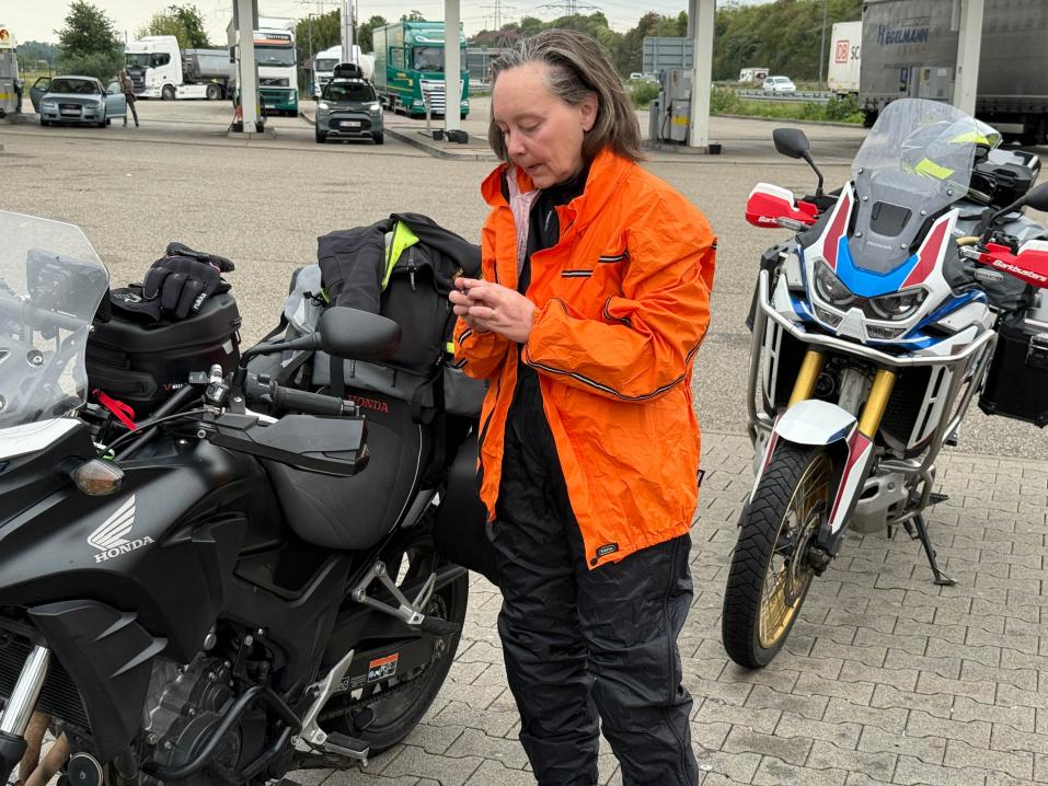 Euroopan puolella oli vielä lämmintä, suorastaan helle, mutta sateilta ei vältytty. Matkan edetessä seurasimme tarkkaan mahdollisia eteen tulevia saderintamia ja kun sateen uhka alkoi olla konkreettinen, pidimme tauon, jolloin sain vedettyä sadekamppeet päälleni.