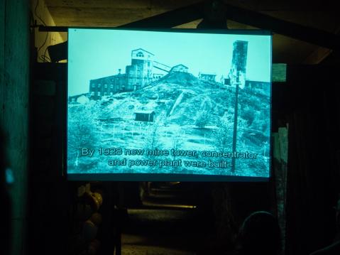 Tasaisin välein on kuvasuurennoksia, joiden luona Kari Moilanen kertoi kaivostyön ja -työläisten historiasta sekä työolosuhteista. Aluksi kuparimalmia kaivettiin todella alkeellisin keinoin. Maan alle mentiin tikkaita pitkin ja kiviaines jouduttiin kantamalla tuomaan maan pinnalle.
