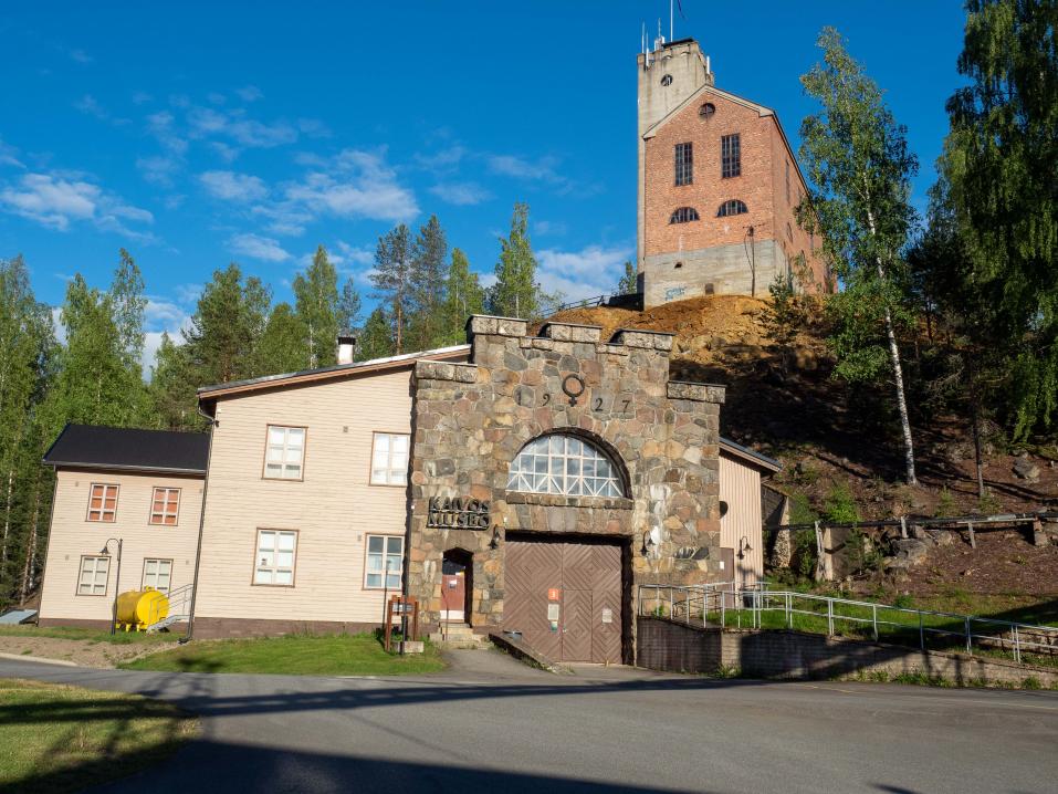 Vanhan Kaivoksen ravintola taustallaan jylhä Outokummun kaivoksen rinnerikastamo ja kaivostorni.